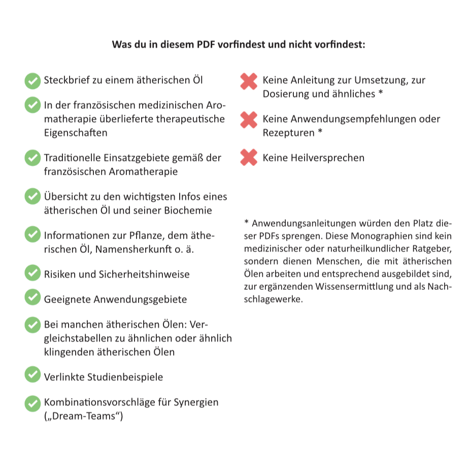 Die Steckbriefe enthalten keine Anleitung zur Anwendung und stellen keine Einladung zur Selbstmedikation dar. Eine praktische Umsetzung erfordert eine entsprechende Fachausbildung in der wissenschaftlichen Aromatherapie und setzt diese voraus. Falls es um eine Umsetzung im medizinischen Bereich geht, ist diese Therapieform außerdem entsprechend ausgebildeten Ärzten und Heilpraktikern vorbehalten!