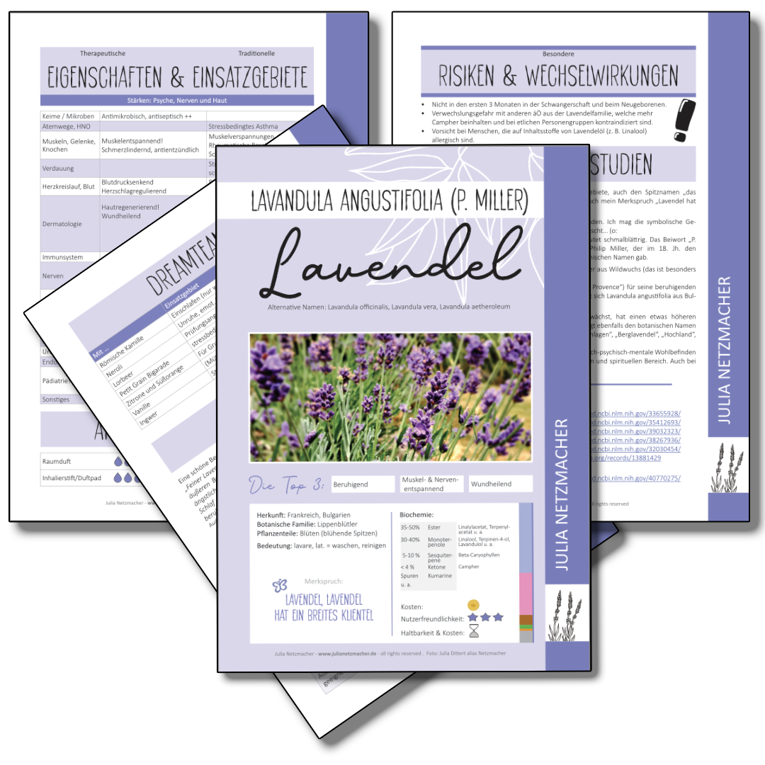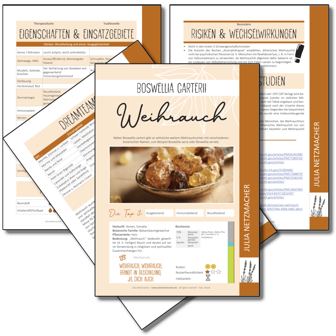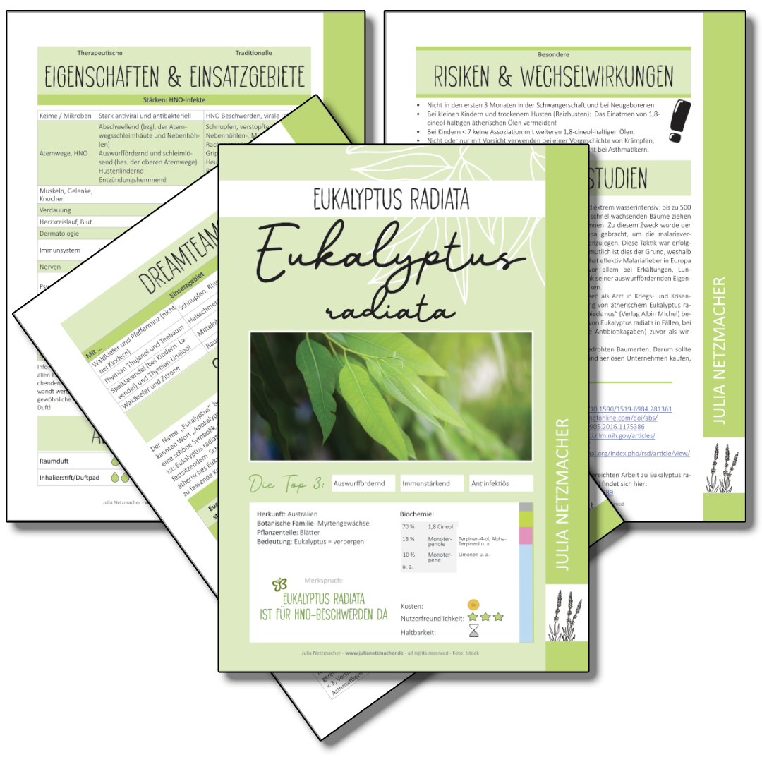 Jedes 4-seitige PDF fasst die wichtigsten Informationen, geeignete Anwendungsformen, bekannte therapeutische Eigenschaften und traditionelle Einsatzgebiete gemäß der FRANZÖSISCHEN, wissenschaftlich-medizinischen Aromatherapie zusammen.