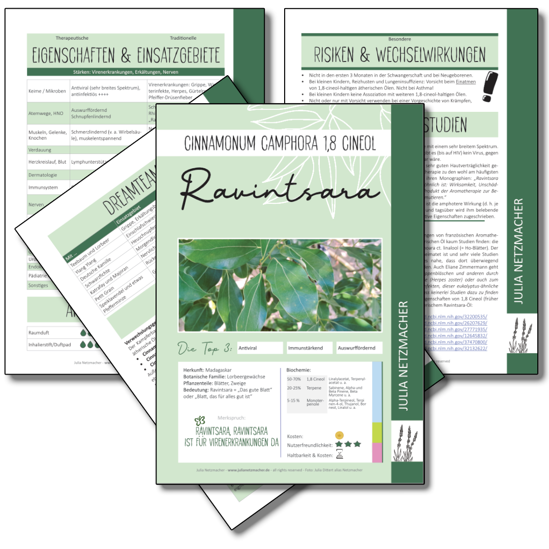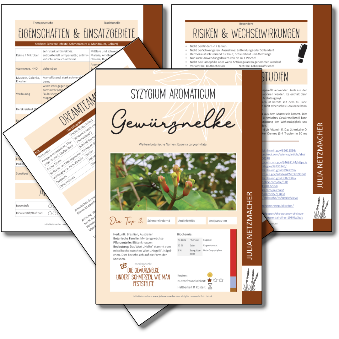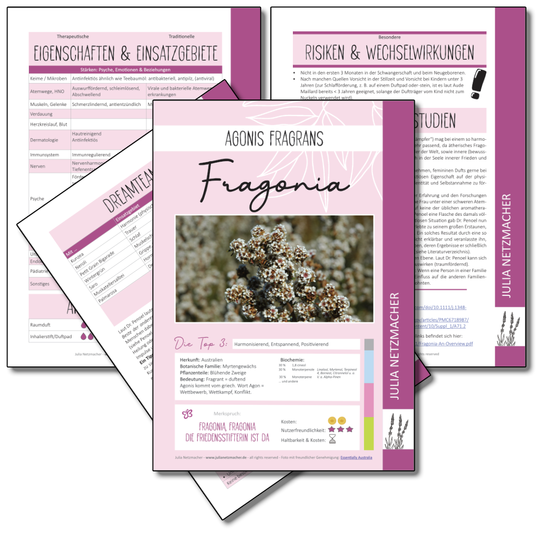 Jedes 4-seitige PDF fasst die wichtigsten Informationen, geeignete Anwendungsformen, bekannte therapeutische Eigenschaften und traditionelle Einsatzgebiete gemäß der FRANZÖSISCHEN, wissenschaftlich-medizinischen Aromatherapie zusammen.